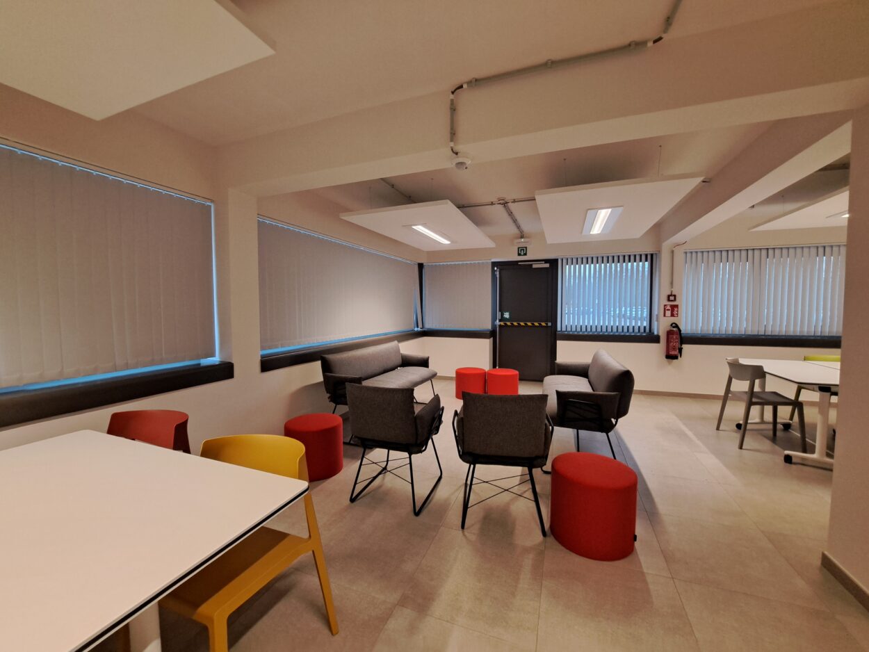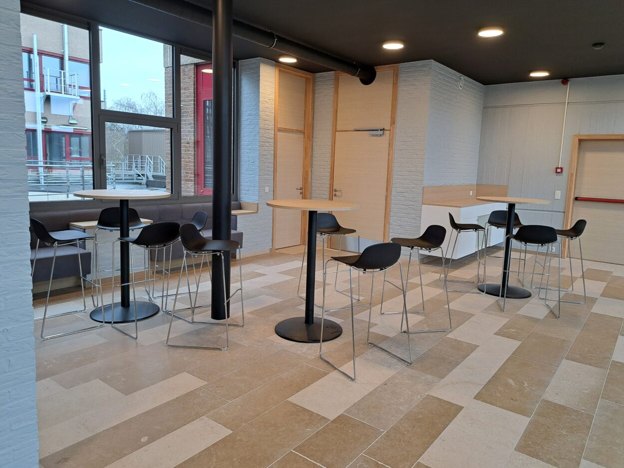 L’installation de volets acoustiques permettent désormais de moduler l’espace soit en une grande cafétéria, soit en deux salles distinctes pouvant servir de salles de réunion. Le mobilier choisi permet aussi de créer différentes zones : une table haute connectée en lien avec la cuisine pour renforcer la collectivité ; un coin « zen » avec fauteuils et poufs, ainsi que des tables modulables et des chaises pour le réfectoire.