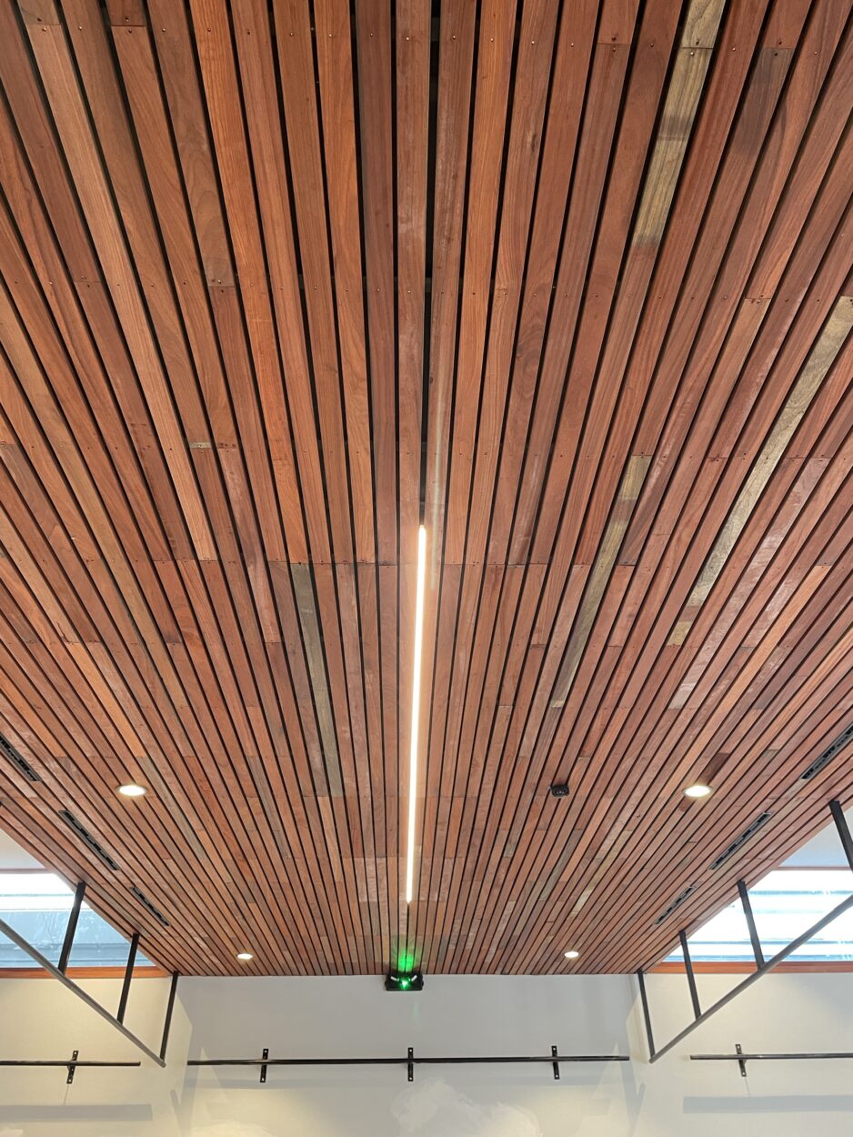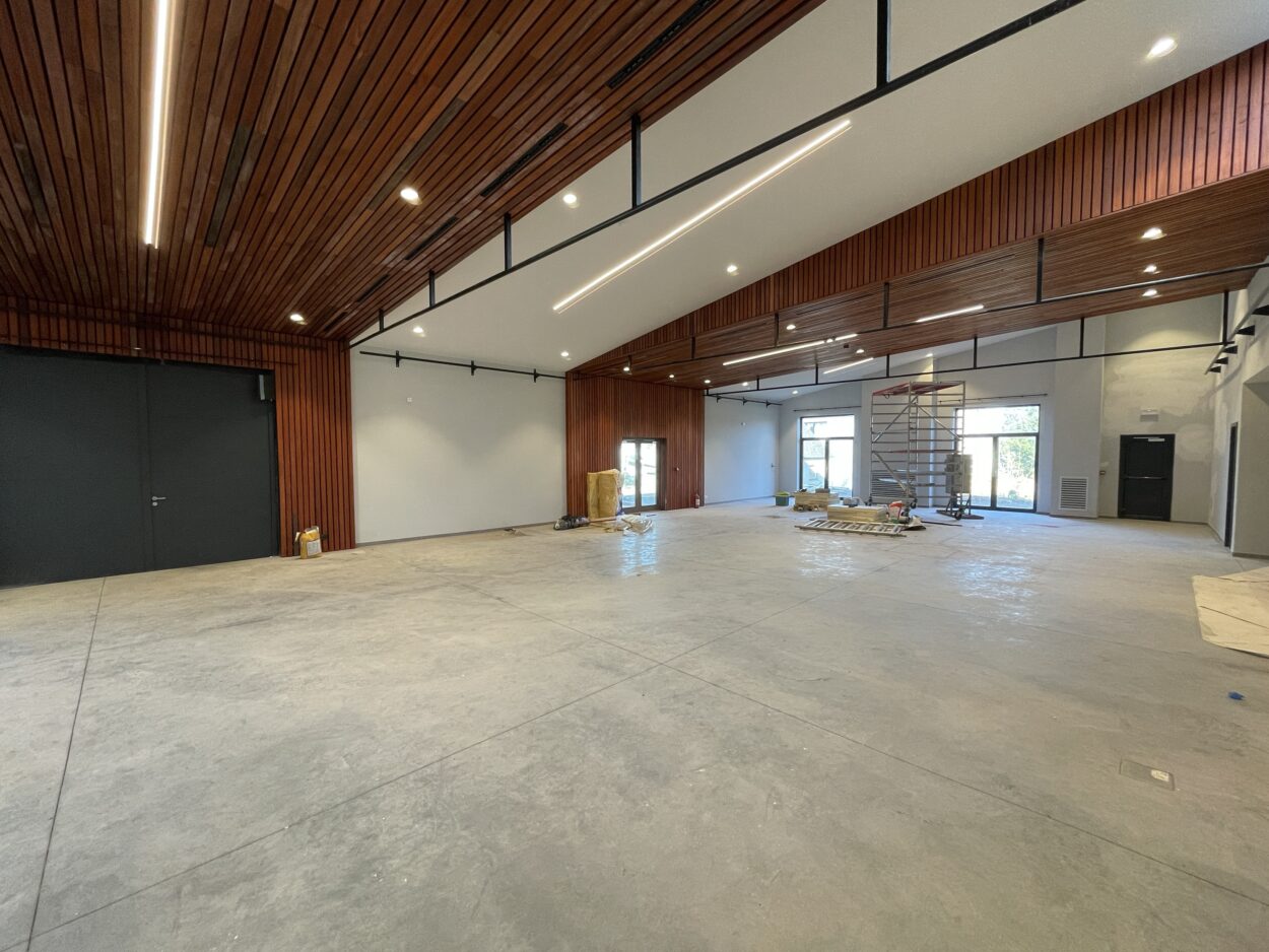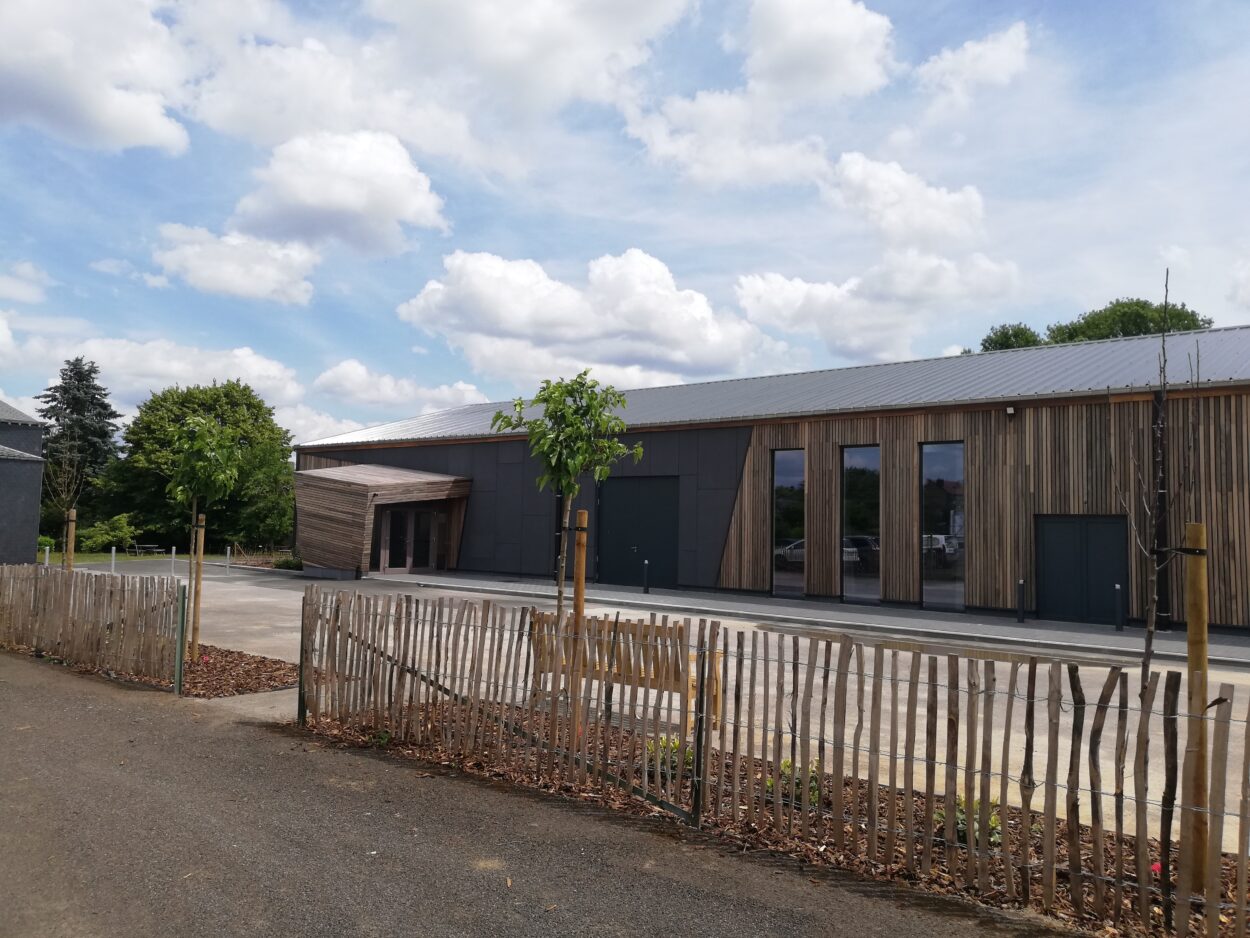 Outre la rénovation du hall, le projet comprenait la création d’une salle multifonctionnelle, un sas d’entrée, une cuisine, un bar, un bloc sanitaire, un espace polyvalent et une salle de réunion. Des travaux connexes ont amélioré l’accès et l’environnement global du site, incluant la mise aux normes du chemin d’accès principal, la démolition d’un garage, un nouveau parking, un local pour les déchets et une nouvelle citerne enterrée au gaz propane. L’aspect extérieur du bâtiment a été soigné tout en conservant sa structure originelle, avec l’ajout d’un sas d’entrée. Le bâtiment a été habillé de trois types de matériaux – acier, bois et fibres-ciment – pour une esthétique moderne et durable.