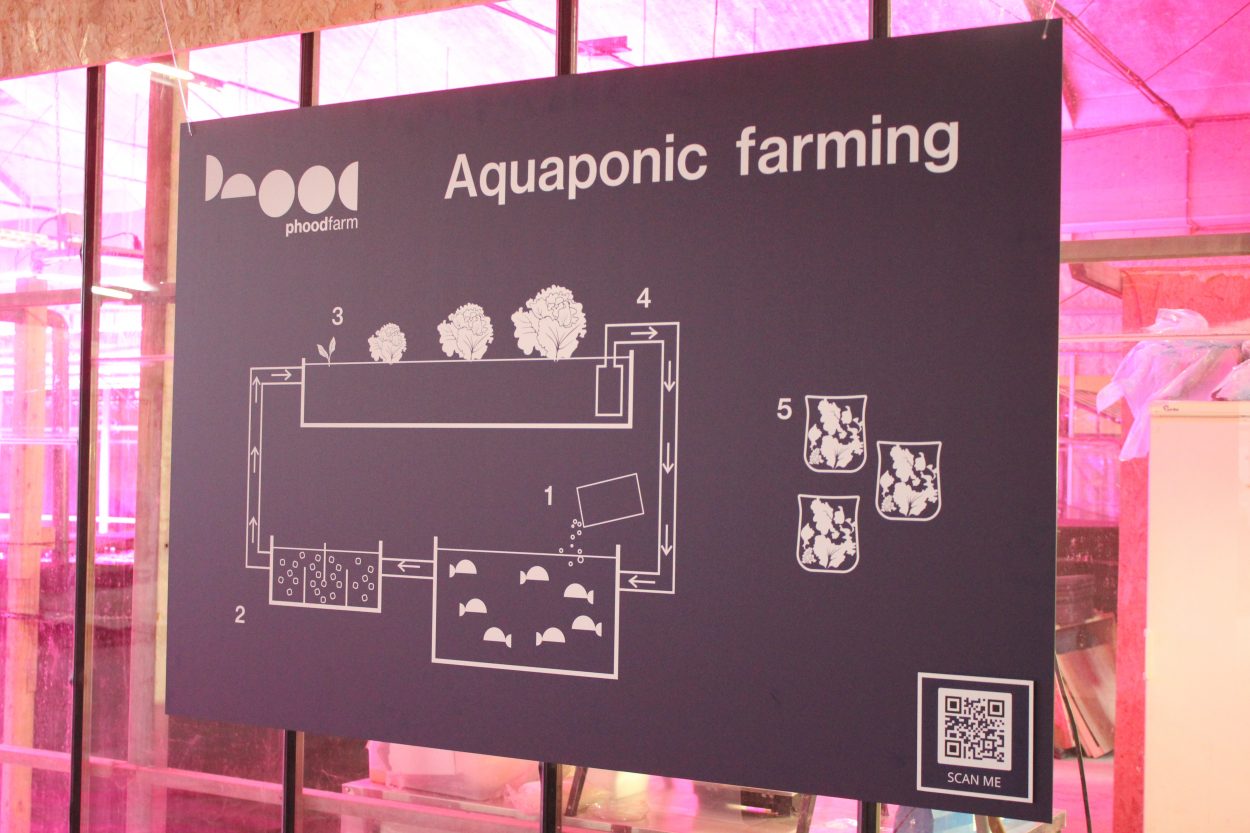L’une des spécialités de Phood Farm est la culture aquaponique qui consiste à cultiver des légumes sur l’eau provenant d’aquariums où sont élevés des poissons. Les déjections des poissons nourrissent les plantes et les racines de celles-ci filtrent l’eau des poissons, la boucle est ainsi bouclée dans un système autorégulé.