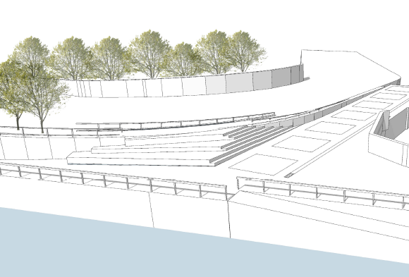 L’objectif du projet d’aménagement est de relier la promenade haute et basse en bord de Sambre via la création de gradins. Ces gradins seront également utilisés comme aire de convivialité depuis laquelle les usagers pourront profiter du panorama. Cet espace aura également comme ambition de capter les personnes de passage sur le Ravel vers le centre-ville de Namur situé à proximité immédiate du site. L’implantation des gradins décuple les possibilités d’arrêt et crée un espace privilégié.